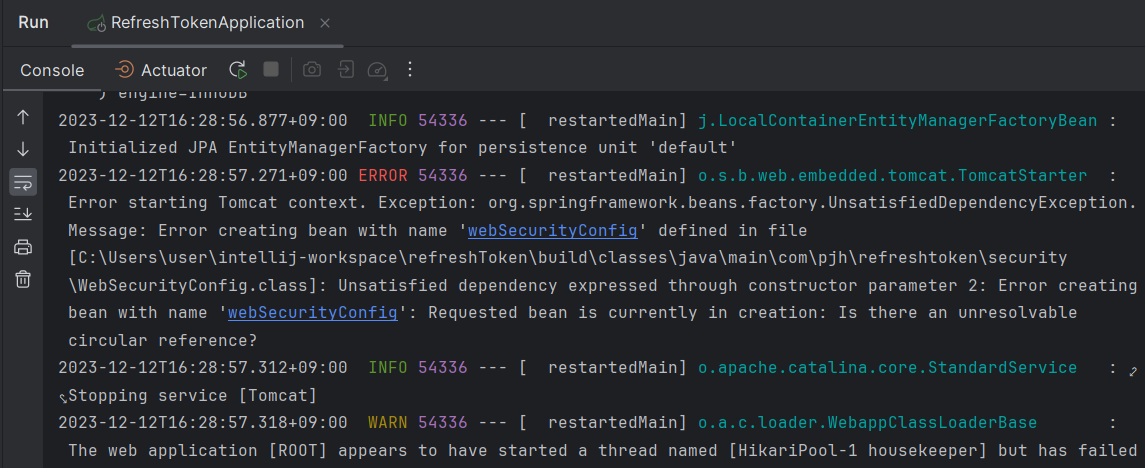 필자의 상황은 WebSecurityConfig.java와 JwtProvider.java 서로 의존성주입을 하고 있는 상황이기에